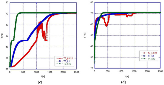 Comparison between simulated and measured temperature during the test with Twall = 71 °C and Tinial = 22.4 °C at the thermocouple: (a) T1; (b) T2; (c) T3; (d) T4.