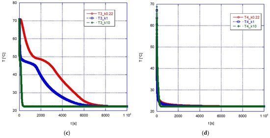 Comparison between the temperatures simulated corresponding to thermocouple (a) T1, (b) T2, (c) T3, and (d) T4 during the solidification phase of the PCM, k = 0.22 W/mK, and the solidification phase of composite materials (PCM+foam) with different thermal conductivities, 1 and 10 W/mK (Twall = 71 °C).