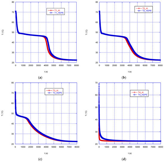 Comparison of the temperature trend inside the sphere using two different wall materials (aluminum and HDPE): (a) T1; (b) T2; (c) T3; (d) T4.