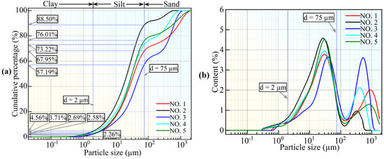 Particle size distribution curve of the five sets of loess samples, measured using a Mastersizer 2000 (UK) laser particle size analyzer. (a) Cumulative particle size distribution curves of loess; (b) particle size density distribution.