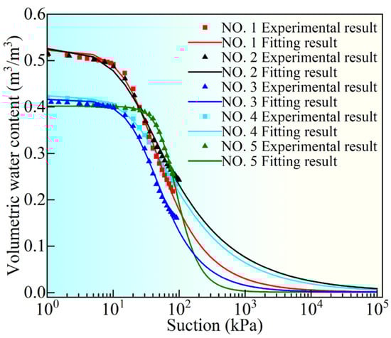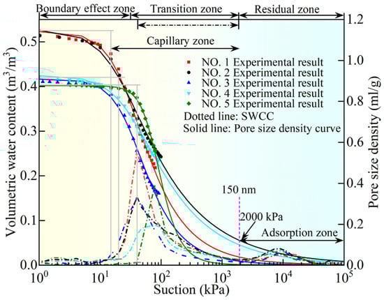 Figure 11 illustrates that the total area of the pore size distribution (PSD) curve and the X-axis governing the upper boundary of the soil–water characteristic curve (SWCC). A larger area indicates a higher saturated volumetric water content. Notably, the saturated volumetric water content decreases with an increasing burial depth for the five undisturbed loess samples. Moreover, the dominant pore range dictates the range of the transition zone in the SWCC. A larger pore size range results in a broader transition zone and a longer desaturation path. This relationship is evident in the order of NO. 1 > NO. 2 > NO. 3 > NO. 4 > NO. 5, where the transition zone range decreases with an increasing burial depth. Therefore, variations in the pore size distribution influence the shape and extent of the transition zone in the SWCC, ultimately affecting the water retention properties of the soil.