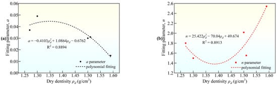 Variations in the fitting parameters a and n with respect to the dry density. (a) The relationship between ρd and parameter a; (b) the relationship between ρd and parameter n.