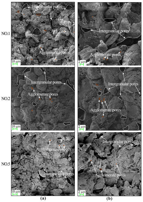 In this study, we examined undisturbed loess samples NO. 1 and NO. 2 from the same layer, as well as NO. 5 from a deeper layer (Figure 1). The SEM images obtained at magnifications of 500× and 1000× for these samples are shown in Figure 6. The images reveal particles of varying sizes loosely arranged, predominantly comprising angular debris particles with some sheet-like aggregates. Granular particle agglomerates are also evident, indicating the presence of aggregates. Particle contacts are mainly indirect or surface to surface, with fewer edge-face contacts and minimal point contacts. Pores of different sizes and shapes are observed between the soil particles. The comparison of the SEM images between NO. 1 and NO. 2 reveals that NO. 1 predominantly contains inter-aggregate or shelf pores between coarse particles, indicating better connectivity. This corresponds to a larger dominant pore diameter and higher pore distribution density in the PSD curve. NO. 2 exhibits a similar microstructure to NO. 1 but with smaller inter-aggregate pores.