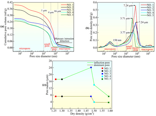 PSDs of undisturbed loess from different depths. (a) Cumulative pore volume curves; (b) pore size distribution curves; (c) pore radius versus dry density.