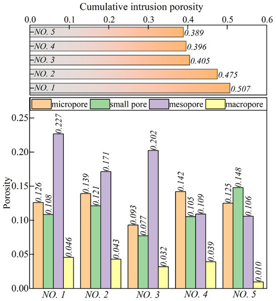 As depicted in Figure 7c, inflection points for NO. 1 and NO. 2 are at 17.3 μm, while those for NO. 3, NO. 4, and NO. 5 are 24.1 μm, 13.9 μm, and 7.2 μm, respectively. Generally, the pore size at the inflection point decreases with an increasing burial depth. Notably, the dominant pore diameter corresponding to the larger peaks of NO. 1, NO. 2, and NO. 3 is 7.24 μm, categorized as a mesopore, while NO. 4 and NO. 5 exhibit dominant pore diameters within the range of small pores, at 3.77 μm and 3.71 μm, respectively.