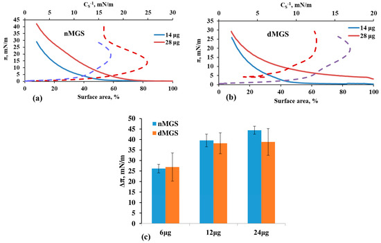 Surface pressure/area (solid lines) and surface pressure/reciprocal compressibility (dotted lines) isotherms of nMGS (a) and dMGS (b) at 14 µg (blue lines) and 28 µg meibum (red lines) deposited at the trough surface, as well as (c) dependence of the maximum surface pressure on the total amount of meibum and the health status of MGS samples. The data of panel (c) represent mean ± standard deviation of samples from five healthy individuals and four MGD patients, respectively.