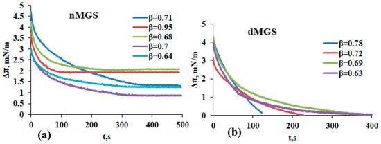 It can be seen (Figure 2) that while β values varied greatly among both “healthy” and “diseased” Meibomian films, the plateau values of Δπ achieved at the end of the relaxation transients were ≥0.8 mN/m for nMGS, while the transients of dMGS layers cannot stabilize to a plateau value and Δπ increment dropped to zero. The latter feature is known to be an indication of mechanically unstable “brittle” layers [16,17,18,19,20].