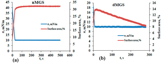 Typical transients, which show that (a) nMGS films maintain constant surface area when kept at constant surface pressure of 10 mN/m while (b) dMGS films register continuous film area loss with time.
