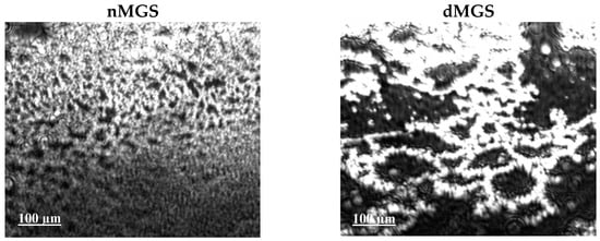 BAM visualization (Figure 4) revealed that while nMGS formed continuous films of multilayer thickness (estimated at around 60–100 nm, as explained previously) [9,10,11,12], in contrast dMGS layers were patchy and consisted of darker regions, probably of monolayer thickness, and thick bright regions which cannot enclose to a continuous structure and instead form a sparse bright mesh at the aqueous interface. For such estimations a simple semi-quantitative model relates the intensity, I, of the film regions in the BAM image with its thickness, d (di/dj = [Ii/Ij]1/2, where the subscripts i and j denote the different images) [3]. These observations agree with previous in vitro and in vivo studies which showed that in MGD the lipid layer structure loses its uniformity, which in turn correlates with loss of TF stability.