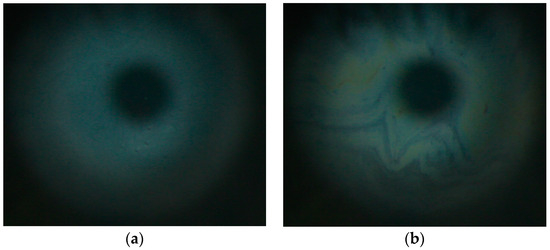 Typical tear film lipid layer morphology in vivo as visualized with specular microscopy (a) prior to and (b) 30 min after instillation of RDA in the tear film.