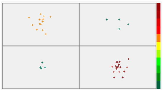 The use of neural networks for clustering datasets generally means using Kohonen networks. These are self-organising learning networks of the competitive-with-competition type. This is different from an unsupervised learning organising algorithm. These networks are applied to a multidimensional data space, and allow one to obtain a two-dimensional structure that preserves the topology of the input set [21]. This network consists of neurons located in two layers—input and output. Each neuron of the input layer is coupled to all the neurons of the output layer. Learning the network involves iteratively modifying the weights of the output layer neurons so that they reflect the input variables as closely as possible. The weights that the output neurons obtain form centroids. Thus, groups are formed by elements at the shortest distance from a given centroid, and cluster around it.