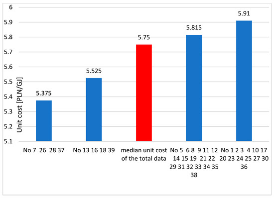 The validity of this division is evidenced by the determined median unit cost of production for each of the diagnosed sets. The unit cost of production has a major impact on the profitability of mines. The amount of revenue is determined by the selling price of coal, over which mines have no influence, while the lowest possible production unit cost can be shaped by optimising production. Mines with the lowest cost are the leaders in production efficiency. The data in Table 6 were used to calculate the median cost, and the results of the calculations are summarised in Table 7 and Figure 3. Two of the four sets of mines group mines for which the median unit cost of production ranks below the median unit cost for all mines, while the next two sets are above the median. The result of this division can be used for further in-depth analysis and pro-efficiency measures.