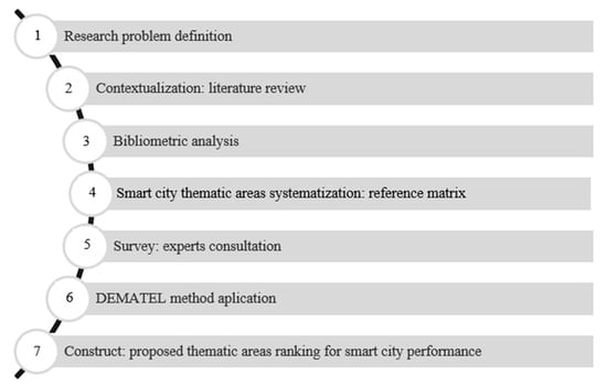Smart cities provide the opportunity for the creation of optimized solutions to improve living conditions around the world, structured to facilitate citizens’ lives, as well as the development of companies and institutions, through qualified urban services. Scientific research contemplates a systematized action located in a specific time and context, which involves a set of procedures around a theme. The methodological definition is necessary for scientific research development, as well as choosing the appropriate method to answer the research objectives, based on data collection, organization, and analysis. The methodological framework and procedures were organized into stages, as detailed in Section 3.