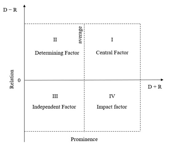 In phase 5, based on D and R, vectors were calculated by axes, with the horizontal axis being vector (D + R) and the vertical axis being vector (D − R). The D + R value coordinates, identified on the abscissa axis, classify the thematic areas by importance level, while the D − R value coordinates, on the ordinate axis, classify the thematic areas by their level of influence on urban spaces. After calculating the vectors, the points found were identified in the cause-and-effect diagram (D + R, D − R), by quadrant, as described in [33], and then classified into central, determining, independent, and impact factors for decision-making (Figure 3).