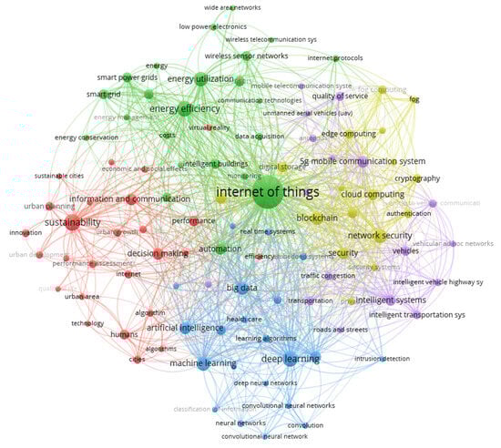 The co-occurrence map includes 104 keywords in five clusters. Cluster 1 (red) connects words with sustainability, urban planning, and decision-making as the linking axes, with emphasis on areas of technology and innovation, and on economy and sustainable consumption. In cluster 2 (green), the interrelationships are based on IoT, energy efficiency, and energy usage, with emphasis on areas of energy, technology and innovation, and living environment and infrastructure. For cluster 3 (blue), the words learning, big data, and artificial intelligence appear, linking networked applications and services, showing the health and assistance area as a catalyst for artificial intelligence solutions. Cluster 4 (purple) approaches the interconnection between intelligent systems, communication, and transportation, with mobility as a central topic. Finally, cluster 5 (yellow) establishes connections between security, network architectures, and information management in the security and protection area.