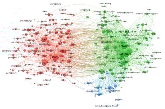 The co-occurrence map includes 263 words in three clusters. Cluster 1 (red) connects the central terms study, research, cities, strategies, impacts, innovation, and governance through actions and solutions in thematic areas of governance and engagement, sustainable economy and consumption, education and training, technology and innovation, and living environment and infrastructure. In cluster 2 (green), the main relations are related to the internet, network, communication, algorithm, devices, and security, covering thematic areas of energy, safety and security, and mobility. Cluster 3 (blue) includes the terms precision, machine, dataset, and detection, highlighting actions in the thematic area of technology and innovation. The co-occurrence analysis provided an opportunity to understand the groupings and relationships between the main recurring words in applied research with an emphasis on smart cities, contributing to expanding knowledge about the perspective of smart cities’ thematic areas.