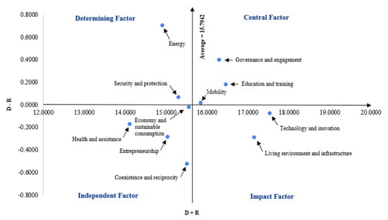 A cause-and-effect diagram was constructed from the coordinates of the vectors D + R (horizontal axis) and D − R (vertical axis), integrating the relationships identified between the 11 thematic areas for smart cities. In the cause-and-effect diagram, the thematic areas were identified using the threshold value (Appendix A) and demarcated into four quadrants (Figure 6 classifies them into central, determining, independent, and impact factors within city management.