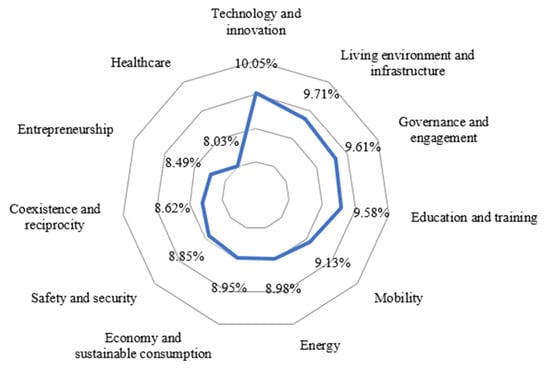 Four thematic areas are highlighted. Technology and innovation are in first place, with 10.05%, impacting other thematic areas, resulting from improvements generated from applied solutions in urban service infrastructure. In second place is the living environment and infrastructure, with 9.71%, including a set of essential services for society’s harmonious survival, considering the population’s daily traveled spaces and actions of immediate visibility. In third and fourth place are the thematic areas of governance and engagement, with 9.61%, and education and training, with 9.58%. The governance area includes a set of urban service management strategies for managing relations with society and focusing on urban spaces’ collective objectives. For education and training, there is the relevant availability of basic and higher education, focusing on different audiences, aiming to improve living conditions and harmony with the environment. Furthermore, the remaining thematic areas also impact urban life and must be considered in the planning of urban spaces by cities in search of developing differentiated strategies.