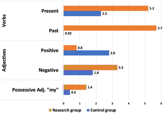 Figure 1 illustrates an overview of the desired content words (adjectives and verbs) and function words (possessives) identified in this study. Due to the similar length of the notes, we decided to present the average number of the desired parts of speech. Regarding the verb analysis, the participants in the research group generally used more verbs. The analysis revealed that the mean of verbs with a past reference (5.7) was slightly higher compared to the present (5.2). In the control group, the mean of verbs in the present was 2.3 and in the past 0.02.