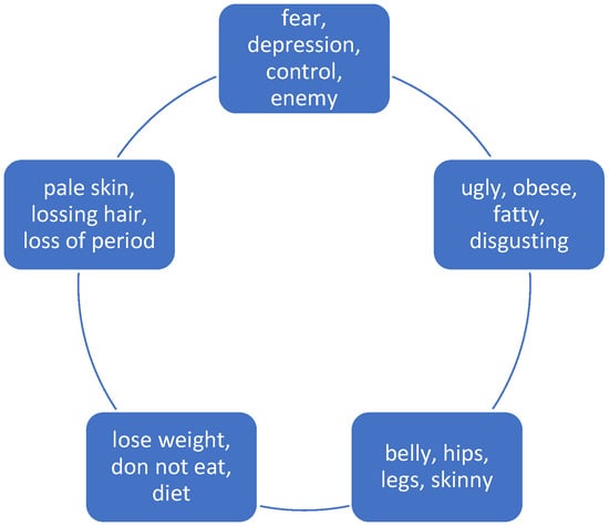 This study also targeted the detection of the characteristic words that indicate the most problematic areas for the patients. As the main feature of anorexia is distorted body image, we focused on filtering terms relating to the body, appearance, and perception. The analysis was mainly qualitative. Our goal was to search for valuable terms in the context of body image that could serve as markers of the altered linguistic profile of people with anorexia. Therefore, we only collected terms that were relevant in our opinion and that, in combination with other language attributes, could complement the method.