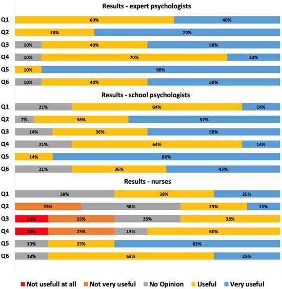 The primary objective of this research was practical, utilizing the developed tool. Therefore, we interviewed a group of ten psychologists who are specialists in anorexia and eight nurses who have everyday contact with a patient and, on many occasions, may notice valuable symptoms or signs that are important in the diagnostic process of anorexic patients. Their positive feedback and suggestions were of great influence and help. That motivated us to broaden the method, so that it could serve as a screening tool at schools. We invited 14 school counselors and psychologists who answered the same set of questions. Table 3 presents the results of the questionnaire. The graphical representation of the results on the Likert scale is found in Figure 3.