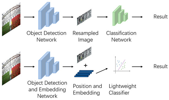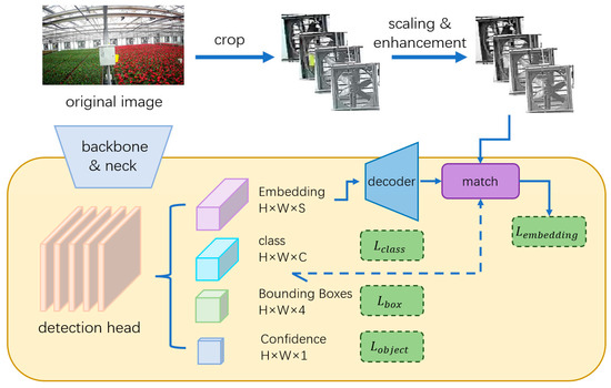 In computational tasks in which concurrent object detection and state recognition is a requisite, conventional methodologies typically necessitate a resampling of the original image after the detection phase, followed by the application of specialized algorithms for state recognition, as shown in Figure 3. Our integrated approach seeks to streamline this process by encapsulating both detection and embedding functionalities within a singular forward pass of the network. This strategy leverages a low-dimensional embedding of the target image, which serves as a distilled representational form, facilitating the extraction of state information with significantly reduced computational demands. We opted for the YOLOv7 model as an object detection network. Among various object detection methods, the YOLO series is widely recognized for its detection speed. YOLOv7, as one of the newer iterations, incorporates many advantages from previous research, making it a comprehensive solution for real-time applications. Specifically, YOLOv7-tiny, a variant with significantly fewer parameters (only 6.2 M), has been proven effective. It strikes an excellent balance between detection speed and detection accuracy, making it highly suitable for edge computing environments in which resources are limited. Concurrently, we incorporated an autoencoder into the YOLOv7 training regimen to imbue it with the requisite capabilities for target embedding.