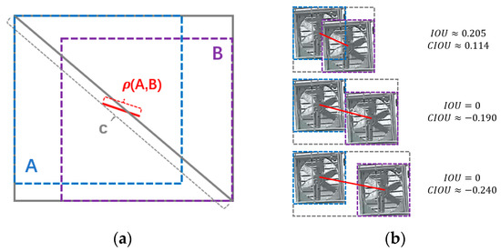 (a) CIOU schematic diagram; (b) comparison of IoU and CIOU in different overlapping situations.