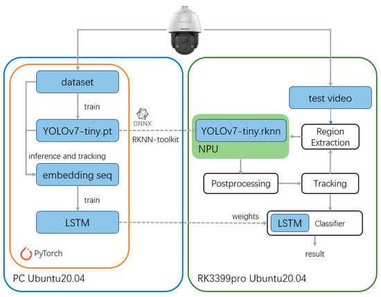 As shown in Figure 8, this study comprises two main experimental sections. Model training was executed on an Ubuntu 20.04 system equipped with an i9-11900k CPU (Intel, Santa Clara, CA, USA) and NVIDIA GTX 3090 GPU (NVIDIA, Santa Clara, CA, USA), boasting 24 G of video memory. The modified YOLOv7-tiny was developed using the Pytorch framework, compatible with CUDA version 11.3. Detection speed was assessed on edge computing devices, specifically on the RK3399Pro platform with Ubuntu 20.04, utilizing RKNPU for YOLOv7’s network inference (RKNN version 1.7.3). The RK3399Pro, developed by Rockchip (Fuzhou, China), is an embedded development board designed for applications in embedded deep learning fields such as intelligent driving, security monitoring, and robotics. It features a multi-core CPU based on ARM architecture, including the Cortex-A72 and Cortex-A53 (Intel, Santa Clara, CA, USA) cores in a big.LITTLE architecture, with a maximum CPU frequency of 1.8 GHz. In addition to the CPU, the RK3399Pro is equipped with Rockchip’s proprietary second-generation embedded RK NPU (Neural Processing Unit) architecture, which operates at a peak frequency of 700 MHz and offers a computational power of up to 3 TOPS. The RKNPU shares 4 GB LPDDR3 memory with the CPU, optimizing the board’s performance in handling AI tasks and making it an ideal choice for edge computing applications that require efficient processing and AI capabilities.