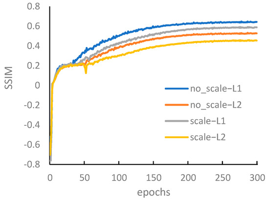 SSIM change curve under different reconstruction loss functions and scaling strategies during the training phase.
