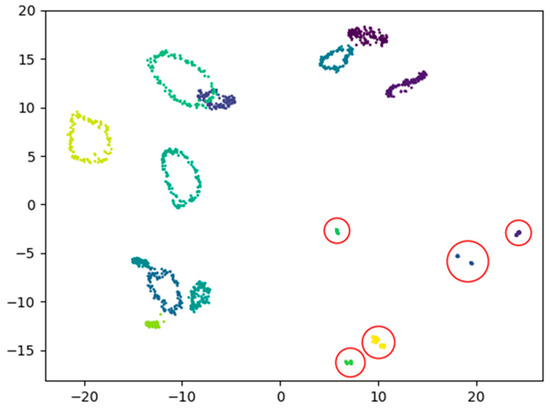 Figure 11 illustrates clusters in which each color-coded point signifies the coordinates of fans in various frames post-PCA reduction. Fans not in operation are encircled in red. These clusters demonstrate distinct groupings that may be influenced by varying angles of capture, leading to differing distributions upon dimensionality reduction. It is important to observe that the fans currently in operation are organized in a ring-like pattern, whereas those that are not operational tend to be grouped in compact clusters. This distinct spatial arrangement can be utilized to identify the operational state of fans.