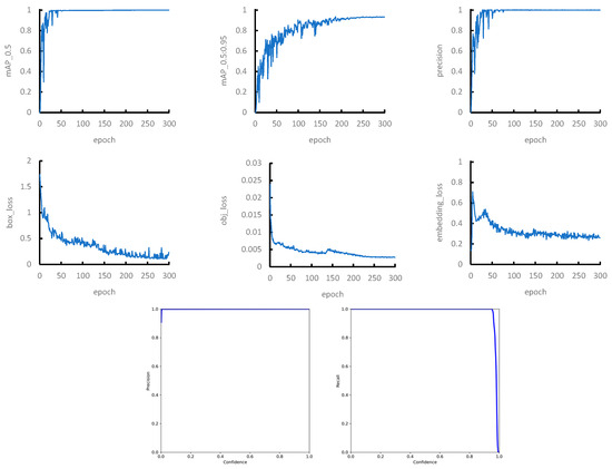 To demonstrate the convergence of the model on the given dataset, Figure 13 illustrates the evolution of loss components and performance metrics throughout the training process of the YOLOv7 model. The x-axis denotes the iteration count, while the y-axis measures the values of loss and metrics. The graph indicates that the model achieves stable performance, with minimal fluctuations in loss and metric values, after undergoing 300 iterations. One thing worth noting is the behavior of the embedding loss, which initially experiences a sharp increase followed by a gradual decrease. This pattern suggests that in the early stages of training, the model struggles to accurately identify targets, leading to calculations involving few to no values. This phenomenon similarly impacts the mAP; as the model begins to recognize some targets, the subsequent rise in embedding loss influences the weight adjustments, temporarily causing fluctuations in the mAP before it stabilizes. Furthermore, the curve of precision and recall versus confidence indicates that the model is capable of accurately identifying fans in the scene.