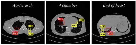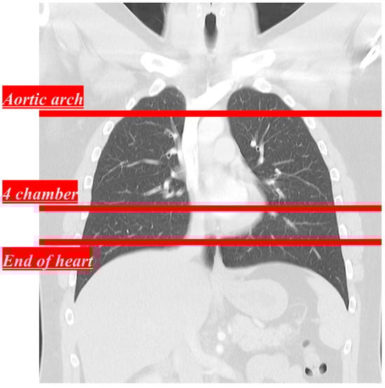 The equipment used in this study was the SOMATOM Force CT imaging system (Siemens Healthineers, Erlangen, Germany). The conditions for obtaining low-dose CT images using a tin filter are presented in Table 1. The parameters of the ADMIRE technique used strengths A2 and A3 as well as kernels B40 and B59. The strengths and kernels used in ADMIRE were the values used in general chest CT scans []. The four combinations of ADMIRE parameters used in this study are listed in Table 2. CT images were obtained at three positions: the aortic arch, four chambers, and the end of the heart (Figure 1).