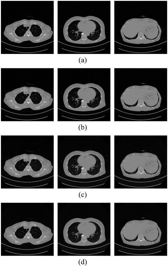 Low-dose CT images according to various ADMIRE intensities and kernel combinations: (a) AD-MIRE A with kernel B40 (Group 1); (b) ADMIRE A3 with kernel B40 (Group 2); (c) ADMIRE A2 with kernel B59 (Group 3); and (d) ADMIRE A2, kernel B59, and NLM noise reduction algorithm (Group 4).