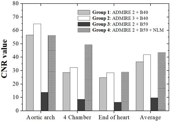 The resulting graphs and values of the CNR, quantitatively analyzed in the ROI set as shown in Figure 2, are presented in Figure 4. The CNR values measured in the aortic arch were approximately 56.49 in Group 1, 64.86 in Group 2, 13.79 in Group 3, and 56.25 in Group 4. In the aortic arch, the highest value was found in Group 2; high values similar to those in Group 2 were found in Group 4. Among the four chambers, Group 4 showed the most improved value at approximately 49.33, while Group 3 showed the lowest value at approximately 8.57. At the end of the heart, as in the previous images, improved results were observed in Groups 4, 2, 1, and 3; the best value of approximately 28.94 was obtained in Group 4. The highest average value was obtained in Group 4, which applied the proposed NLM noise removal algorithm to low-dose CT images. In addition, as compared with the Group 2 images obtained based on relatively high ADMIRE intensity and low kernel, the CNR was higher in Group 4 using the NLM noise removal algorithm.
