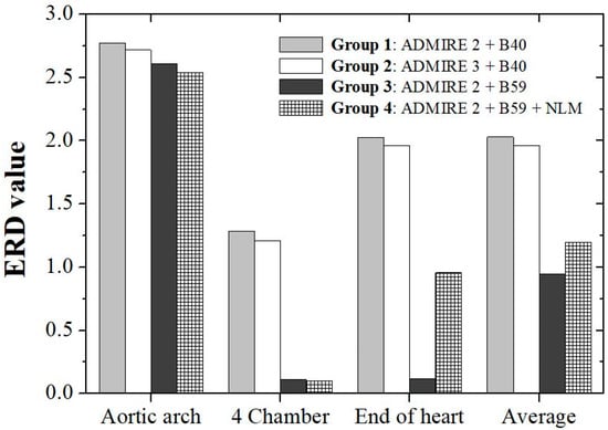 The resulting graphs and figures of the ERD, quantitatively analyzed in the ROI set as shown in Figure 2, are shown in Figure 5. The ERD values measured at the aortic arch were approximately 2.77 in Group 1, 2.71 in Group 2, 2.61 in Group 3, and 2.53 in Group 4, with Group 4 showing the best value. Among the four chambers, Group 4 showed the most improved value of approximately 0.100, while Group 1 showed the lowest value of approximately 1.28. At the end of the heart, similar to the previous images, improved values were obtained in the following order: Groups 3, 4, 2, and 1. Group 4 also showed an excellent average ERD value of approximately 1.19, which was similar to that of Group 3. As a result, the best value was obtained in Group 3 based on ADMIRE A2 and kernel B59; similar results were obtained with an average of approximately 1.19 in Group 4, which applied our proposed NLM noise removal algorithm to low-dose CT images. Additionally, in Groups 1 and 3, using the same ADMIRE A2, the ERD value of Group 3 using a high kernel significantly decreased as compared to that of Group 1 (Group 1 vs. Group 3).