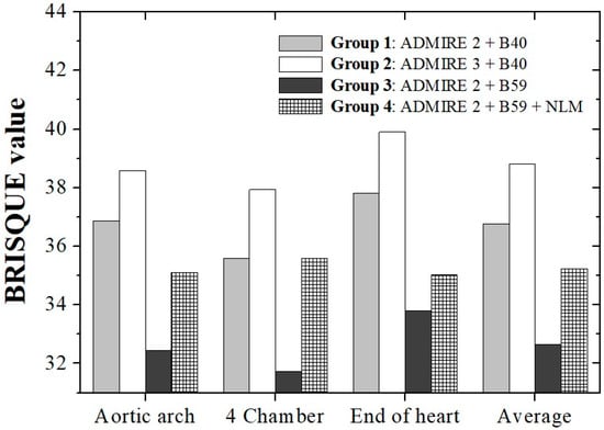The results of the BRISQUE evaluation are shown in Figure 6. In the aortic arch, values of 36.87 Group 1, 38.58 Group 2, 32.45 Group 3, and 35.10, Group 4 were derived in groups 1, 2, and 3, with group 3 showing the best value. Among the four chambers, Group 3 showed the most improved value at approximately 31.73, while Group 2 showed the highest value at approximately 37.93. At the end of the heart, improved results were obtained in the following order: Groups 3, 4, 1, and 2. Similar to Group 3, Group 4 showed improved results of approximately 35.23. As a result of the BRISQUE evaluation, there was variation depending on the slice; the best value was obtained in Group 3, based on ADMIRE strength A2 and kernel B59, with an average of approximately 32.66.