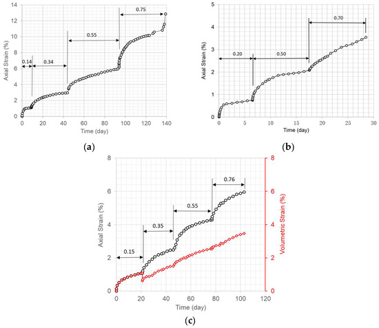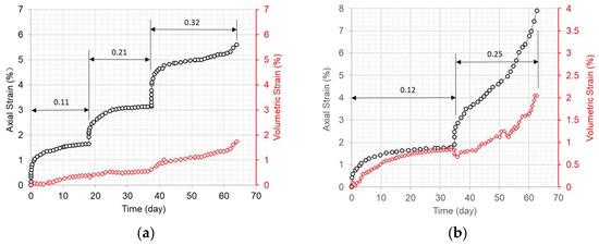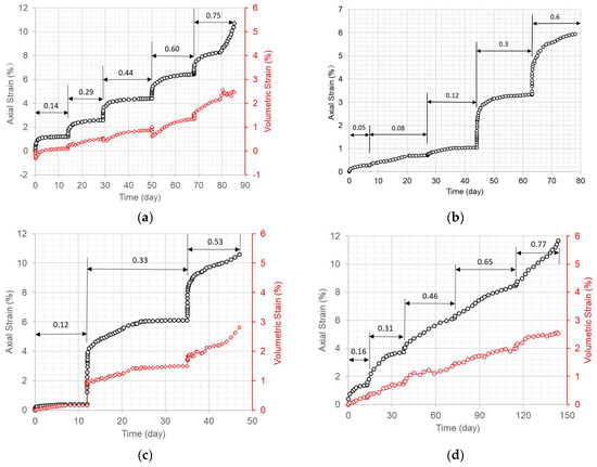 Figure 1c, Figure 3a,c,d and Figure 4 show that the volumetric strain responded with time in a similar way to the axial strain. All of the volumetric strains were compressive strains. A few tests (Figure 1c, Figure 3a and Figure 4b showed some instantaneous dilation in the volumetric strain due to the swift imposition of an increase in deviator stress during the tests.