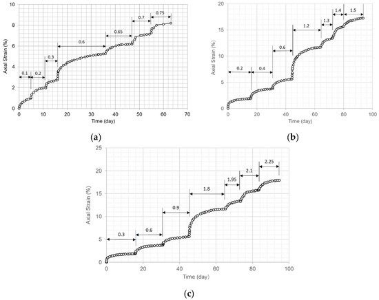 Axial strain versus time for dam core specimens under various radially confining stress levels and at 15 °C with a stepwise increase in axial stress (unit: MPa). (a) Confining stress of 0.5 MPa. (b) Confining stress of 1.0 MPa [13]. (c) Confining stress of 1.5 MPa.