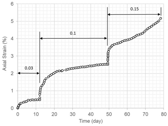 Axial strain versus time for dam core specimens under a radially confining stress level of 0.8 MPa and at 30 °C with a stepwise increase in axial stress (unit, MPa).