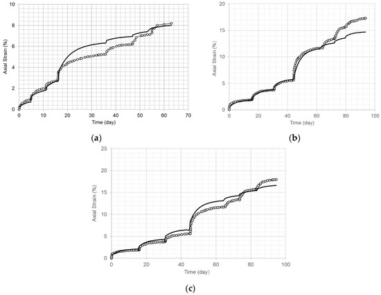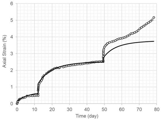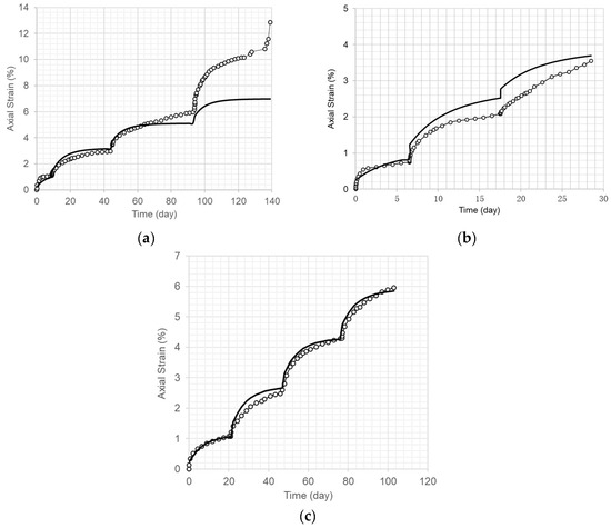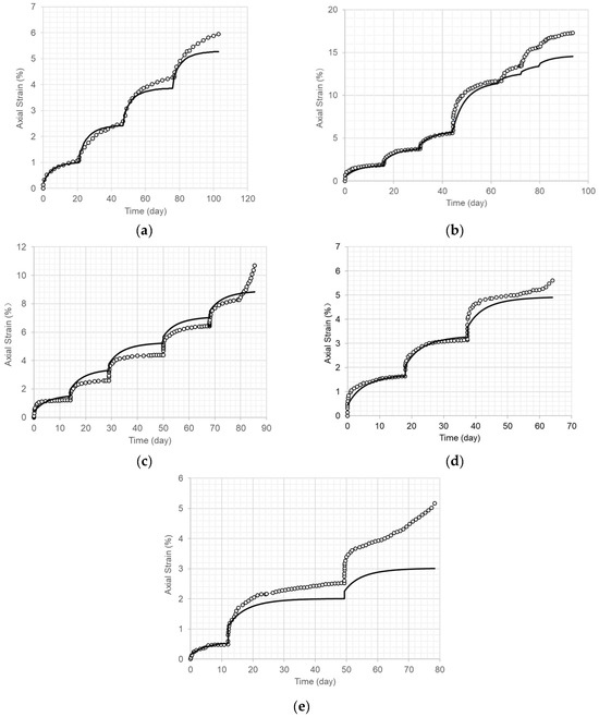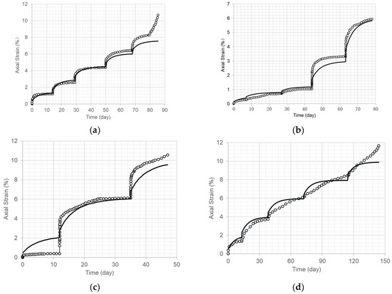 According to the established SSTTC model (Equations (8) and (11)–(14)), the typical long-term creep curves derived by using the generalized model were compared with the test curves, as shown in Figure 13.