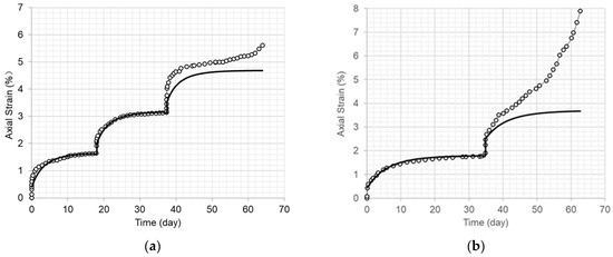 Comparison of the long-term axial creep strain curves (solid line) using the material model and the test results for dam core specimens under various radially confining stress levels and at 25 °C. (a) Confining stress of 0.5 MPa (refer to Figure 4a). (b) Confining stress of 1.0 MPa (refer to Figure 4b).