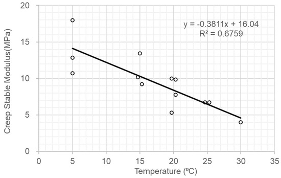 From Equation (7) and the test results shown in Table 2, the relationship between the creep-stable modulus Ecs and temperature is shown in Figure 14.