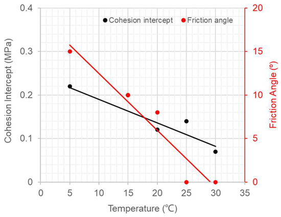 Under conditions of high deviator stress, asphalt concrete is unable to reach a creep-stable state of equilibrium and presents plastic flow. The creep strain continues to increase, and the asphalt concrete eventually fails. There must be a stress-state boundary where asphalt concrete changes from a creep-stable state to a creep-unstable state. This boundary was defined as the plastic yield boundary (PBY) by Wang and Höeg [10]. The PBY can be estimated by using creep tests with stepwise loading. The deviator stress at the PBY is larger than the last step of creep-stable deviator stress but is smaller than the step of creep-unstable deviator stress. Applying the Mohr–Coulomb criterion, the relationships of the cohesion intercept and friction angle with temperature for the PBY are shown in Figure 16.