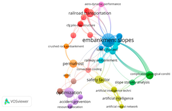 China has one of the most diversified hydrological systems in the world [9], with a complex network of rivers, such as the Yellow and Yangtze Rivers, as well as enormous lakes, such as Qinghai Lake and Dongting Lake. The area surrounding Dongting Lake (the study area), near the Nanhu railway embankment between Beijing and Guangzhou provinces, has been affected by the lake’s fluctuations (and resulting groundwater changes), resulting in multiple failures and constant repair. As a result, these situations not only accelerate embankment deterioration but also drive up rehabilitation and maintenance costs [10]. To address these challenges, several solutions have been used, including the placement of soil reinforcement techniques ranging from fibers and rock mixtures [11] to steel piling [12]. However, the control of traffic loads and the consequences of climate change have made these efforts persistently difficult [13]. Ensuring the long-term stability of embankment slopes under water level fluctuation requires advanced engineering solutions that could capture seasonal and long-term fluctuations while allowing for increased traffic demands at the same time [14,15]. An attempt to address these difficulties is crucial to ensuring the reliability and resilience of critical transportation systems [16]. Recent studies have stressed the relevance of incorporating soil hydromechanical parameters for evaluating the performance of embankment slope constructions under different geohazard conditions [17,18,19,20]. Using the bibliometric tool VOSviewer 1.6.19 to analyze previous studies from the Scopus database revealed a noticeable trend in slope stability analysis under changing water levels and limited work on sensitivity and optimization of slope stability factors (see Figure 1).