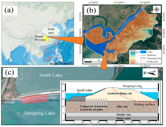 (a) Nanhu Embankment location map in Hunan province, China, (b) administrative boundaries map of Yueyang Study area location, and (c) location and cross-section of the embankment.