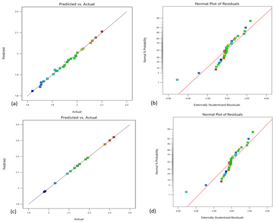 Figure 9 shows the comparison between the data from the ANN and BBD-RSM models and the actual data to determine model accuracy. Scatter plots comparing each value to the number of runs showed that model-predicted values matched actual values. This comparison study found that the BBD-RSM model aligned data better than the ANN model. Thus, the BBD-RSM model slightly outperformed the ANN model in data representation.