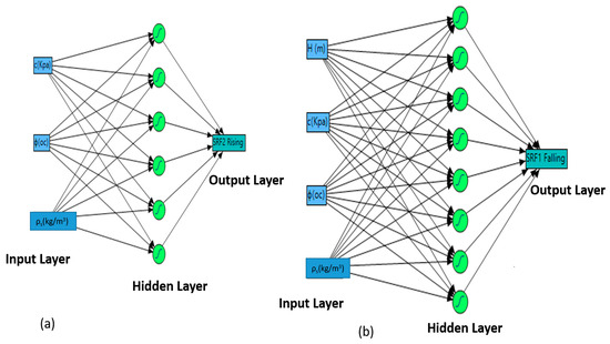 Building an artificial neural network required identifying model ambiguity and choosing a network design to reduce input integration mistakes and improve efficiency [53]. A neural network (ANN) was used to assess hydromechanical parameter efficacy [54,55]. The RWL stability coefficient input parameters are cohesion, internal friction angle, and unit weight (Table 4). The FWL stability coefficient input factors are cohesion, internal friction angle, water level, and unit weight. Due to differential initial conditions, the output factors, RWL stability coefficient, and FWL stability coefficient were examined separately. A “feed-forward back-propagation” network design was used to handle the modeling system’s complexity and parameter selection [56]. The FWL network had a 4-8-1-layer pattern with eight hidden layer neurons to connect the input and output layers. Table 4 shows the statistical model values used for all neuron architectural standards (Figure 6).