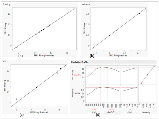 ANN model RWL response graph of predicted and actual values for (a) training, (b) validation, (c) testing, and (d) optimization profiler.