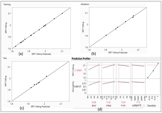 The model plots the FWL safety coefficient’s observed vs. expected responses in Figure 3c. The graphic shows the accurate prediction and use of the FWL safety coefficient in the railway embankment slope response model. The datapoints align well with the line of best fit, indicating good agreement between actual and predicted outcomes [41]. Figure 3d depicts a randomly and sparsely scattered residual plot for the FWL safety coefficient response model, showing that errors are not correlated and have equal discrepancies. The normal residual plot is appropriate because most responses cluster around the line of fit, validating the accuracy and reliability of the generated model (Figure 3). Strength lines represent lines of best fit, while blue, green, and red dots denote the level of agreement of predicted values corresponding to low, medium, and high values of the factor of safety, respectively.