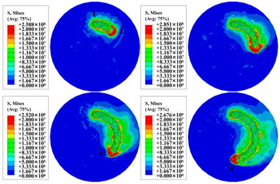 Fracture pit-induced rock stress cloud in varied-speed diamond rock breaking: (a) 2 m/s; (b) 7 m/s; (c) 9 m/s; (d) 12 m/s.